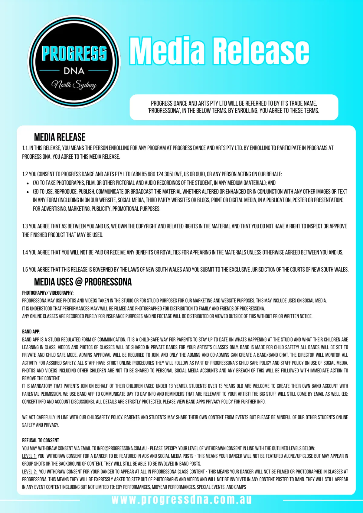 PROGRESS DANCE AND ARTS PTY LTD – Media Release/Policy
