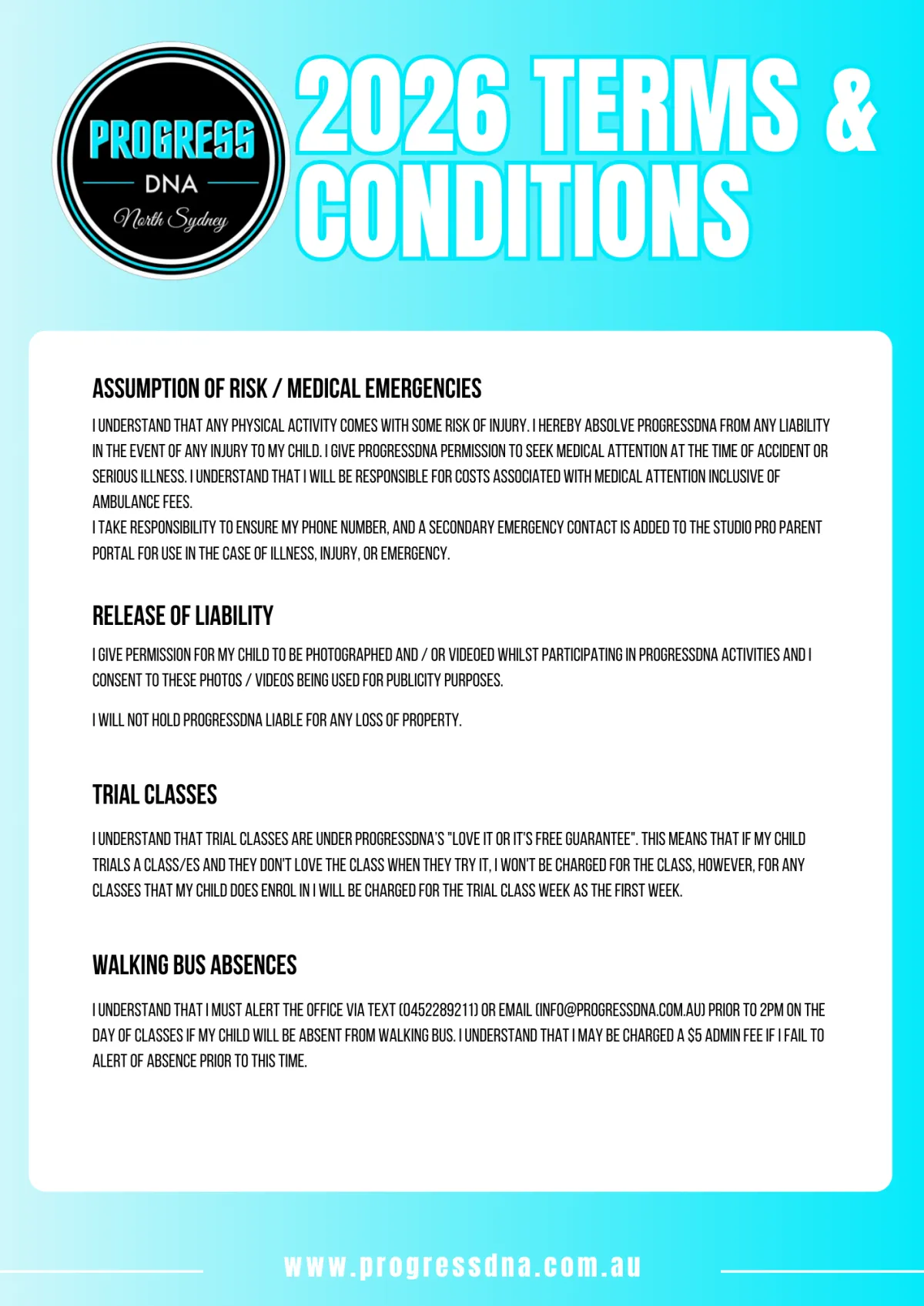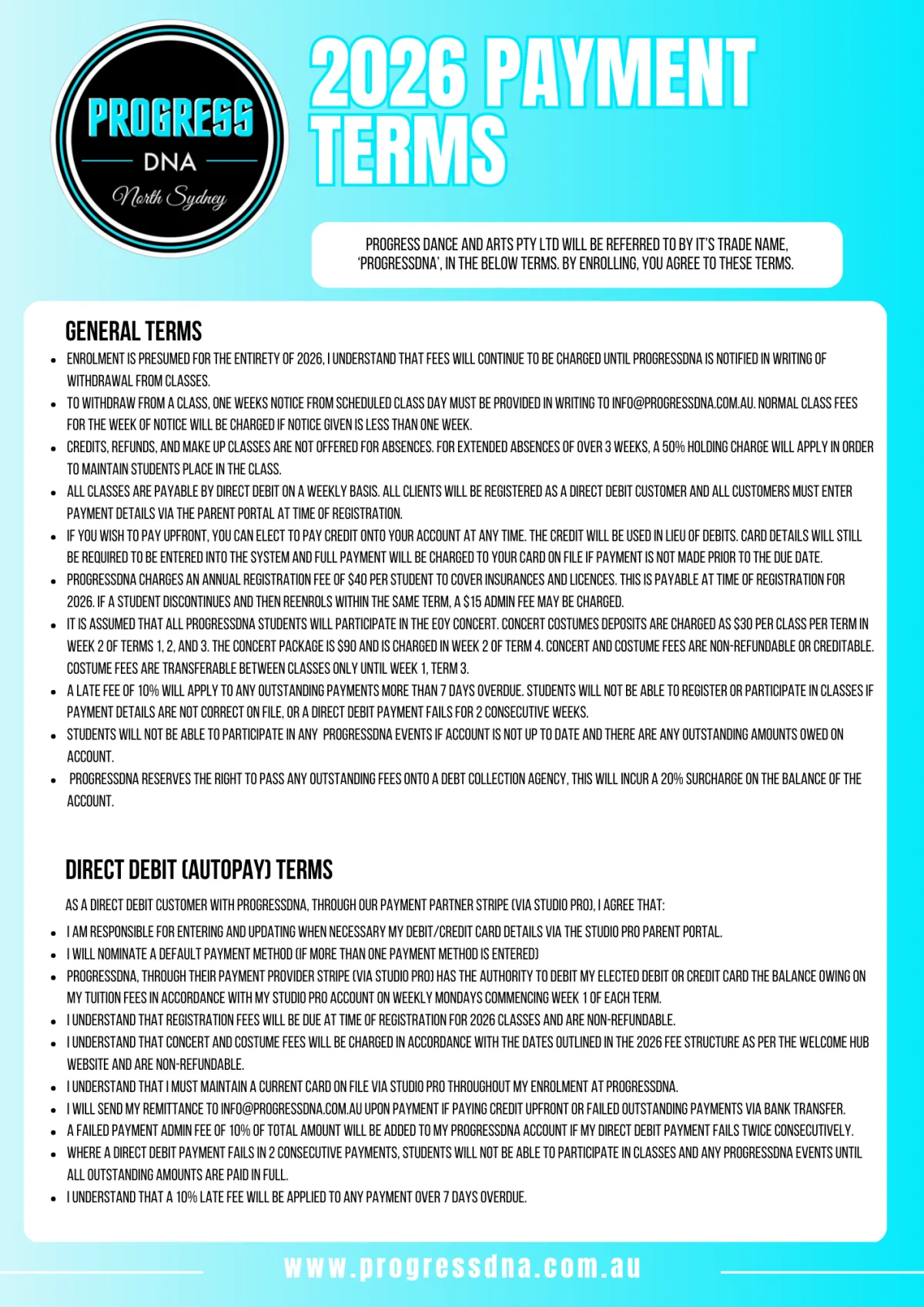 PROGRESS DANCE AND ARTS PTY LTD – Terms and Conditions